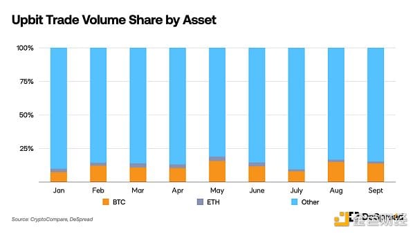 - **高风险、高回报的投资风格:**尽管Upbit的比特币(BTC)和以太坊(ETH)交易量占总交易量的一小部分,但美国代表性的加密货币交易所Coinbase在这两种加密货币的交易量占比较大。Upbit上的大多数个人投资者对具有高利润潜力的山寨币表现出浓厚兴趣,并愿意接受相关的高风险。这被认为是韩国市场中另类币交易占比较高的原因之一。