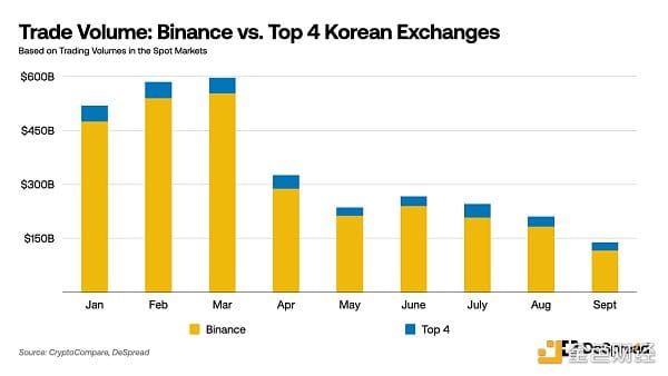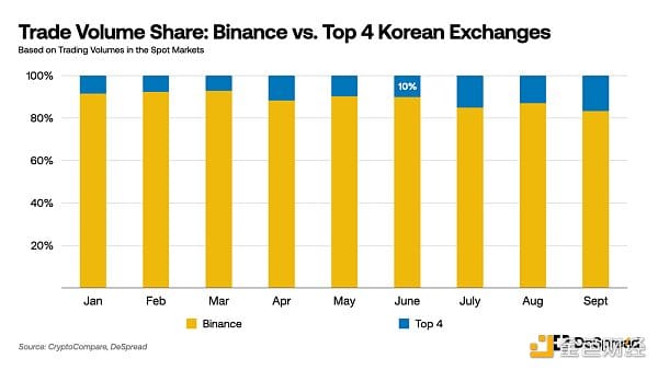 交易量占比:币安(黄)VS韩国四大交易所(蓝)