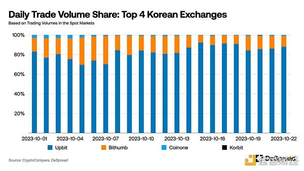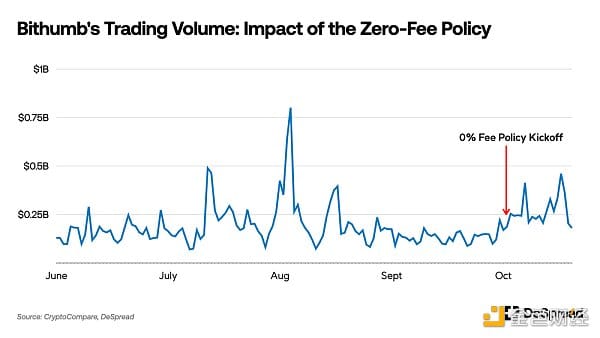 - 零手续费政策的效果:韩国第二大交易所Bithumb于10月4日实施0手续费政策。 这一政策最初产生了积极效果,Bithumb 交易量增加,市场份额超过 20%。