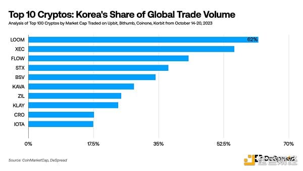 - 韩国投资者青睐的加密货币:上图显示了韩国投资者主要感兴趣的加密货币。通过分析上周与全球市场相比在韩国交易最活跃的加密货币数据,我们发现 Loom Network (LOOM) 成交量最高,占比达62%,位居榜首。 其次是 eCash (XEC)(占 55%)和 Flow (FLOW)(占 43%)。 Stacks (STX) 和 Bitcoin SV (BSV) 也上榜,比例分别为 37% 和 34%。