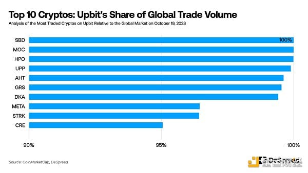 - **“泡菜币”主要在Upbit上交易:**在Upbit上交易的加密货币中,Steem Dollars($SBD)、Moss Coin($MOC)和Hippocrat($HPO)占全球交易量的100%,且仅在Upbit上交易 。 此外,Sentinel Protocol ($UPP)、Aha Token ($AHT) 和 Groestlcoin ($GRS) 等加密货币主要在 Upbit 上交易,并被称为泡菜币,因为它们在全球市场上并没有受到太多关注。 这些代币主要由韩国投资者进行交易,并在Upbit平台内形成自己的市场。