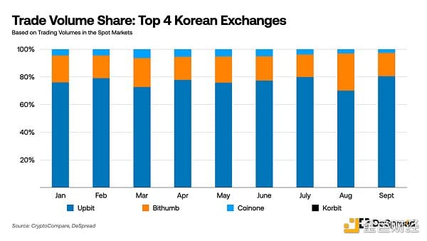 - Upbit碾压竞争:今年2月,Upbit创下最高交易额360亿美元,占据韩国加密货币交易所市场约80%的份额,保持主导地位。 虽然8月份市场份额短暂下降至70%,但随后一个月迅速反弹至80%,市场份额呈现一致趋势。