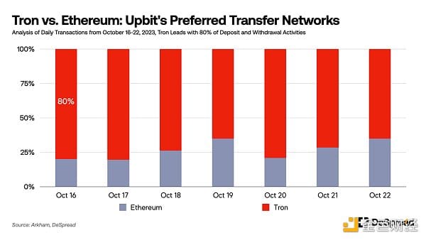 Tron(红) VS 以太坊(蓝):Upbit 的首选传输网络